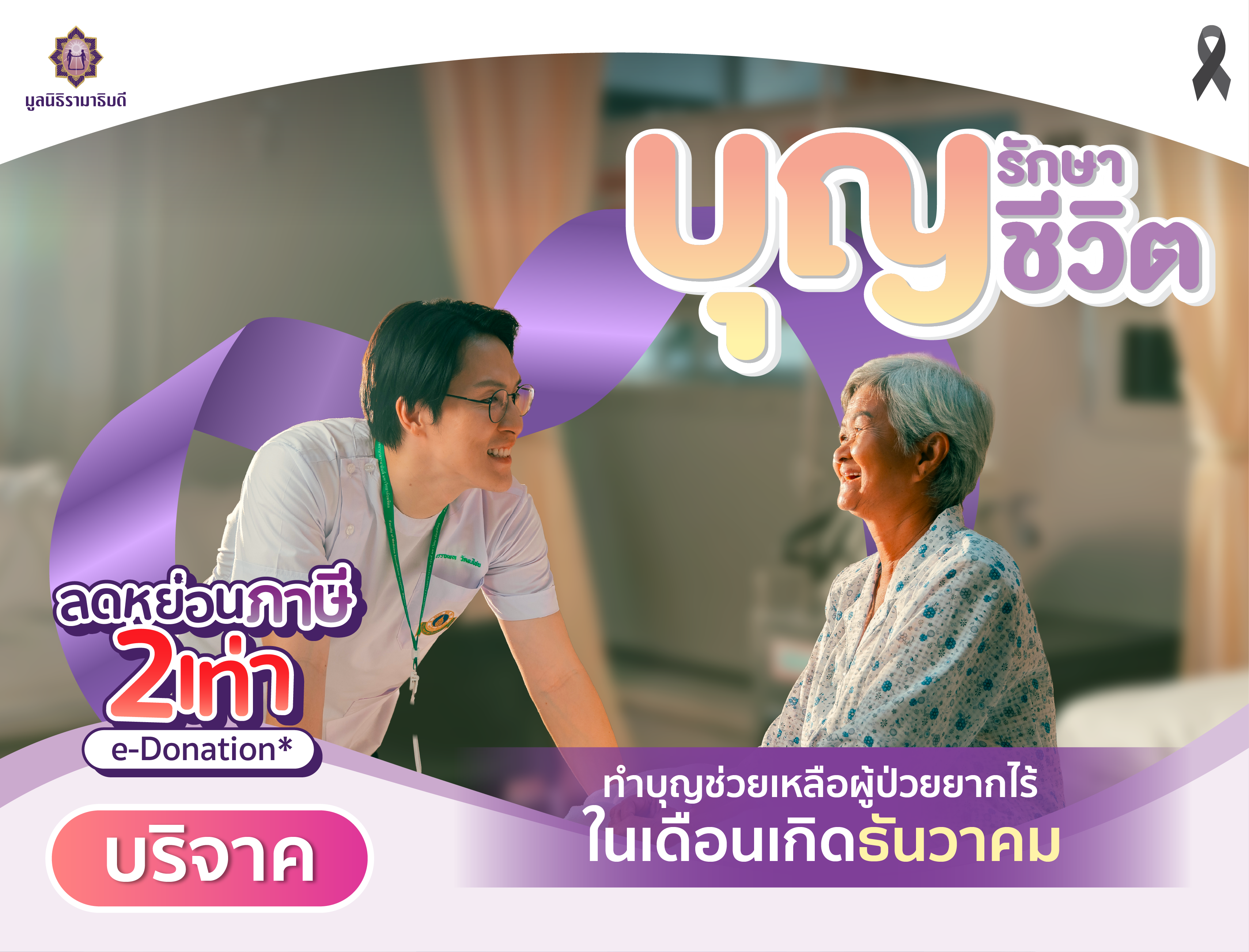 “โครงการเพื่อผู้ป่วยยากไร้” เกิดจากความตั้งใจที่จะช่วยเหลือผู้ป่วยโรงพยาบาลรามาธิบดีที่ไม่สามารถรับภาระค่าใช้จ่ายในการรักษาพยาบาลได้ และรับโอกาสเข้าถึงการรักษาอย่างมีประสิทธิภาพ ***สามารถลดหย่อนภาษี 2 เท่า e-Donation มูลนิธิรามาธิบดีฯ บริการส่งข้อมูลให้กรมสรรพากร